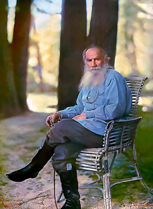 Единственный цветной портрет Льва Толстого относится к числу самых ценных и известных фотографий Прокудина-Горского. Снимок сделан 23 мая 1908 года, незадолго до 80-летия писателя. В начале месяца Прокудин-Горский — к тому времени авторитетный ученый, широко известный и в России, и за рубежом, — написал Льву Толстому письмо с предложением сделать его цветной фотопортрет. Разрешение на приезд было получено. В Ясной Поляне Сергей Прокудин-Горский провел два-три дня и сделал несколько фотографий Льва Толстого и его имения. Однако большая часть оригиналов этой серии была утрачена. Цветоделённые негативы сделанных Прокудиным-Горским портретов Льва Толстого не найдены. Этот портрет воспроизведен с авторского литографского оттиска.