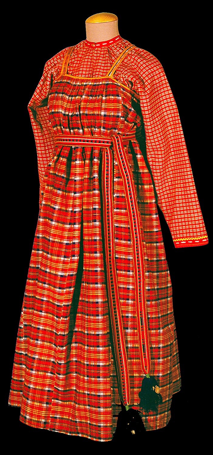 Прямой, на узких пришивных лямках. Сшит вручную из семи полос хлопчатобумажной пестряди ярко-красного цвета в белую, жёлтую и синюю клетку. Верхний край собран в мелкую сборку и окантован ярко-жёлтой тесьмой. Подол подшит полоской черной ткани.