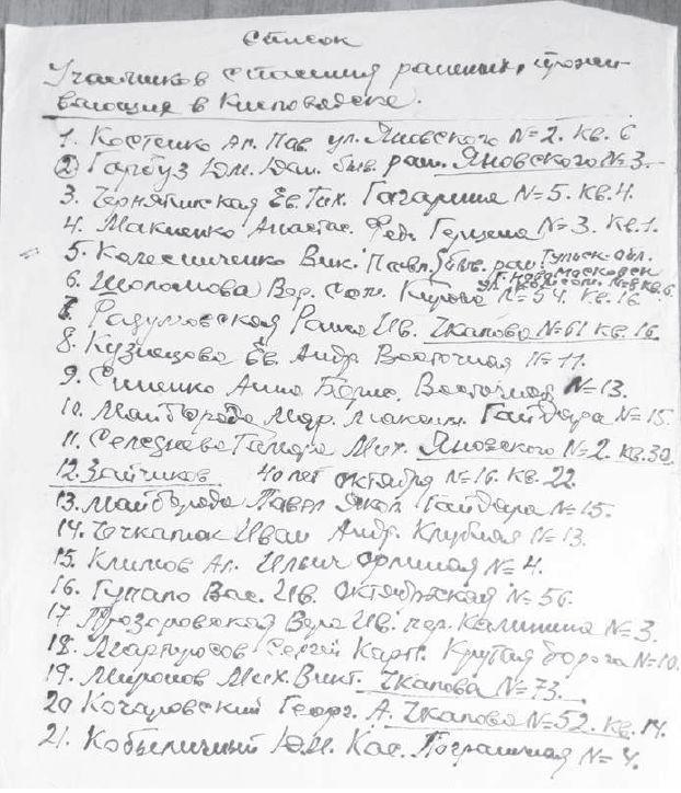 Список жителей Кисловодска и окрестностей, спасавших у себя раненых бойцов и командиров Красной армии во время гитлеровской оккупации края.