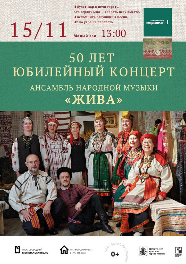 15 ноября на свой юбилейный концерт приглашает ансамбль народной музыки «Жива» — на протяжении вот уже 50-ти лет его участники бережно сохраняют традиции русской песенной культуры, возрождают обычаи и обряды южнорусских регионов России, собранные в этнографических экспедициях. В этот день особенно приятно встретить друзей и единомышленников, вспомнить счастливые моменты, спеть любимые песни!