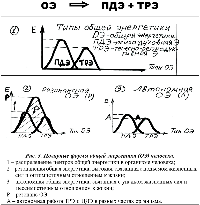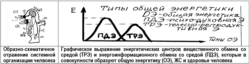 Общеситстемный подход к человеку в предыдущих Разделах отображался во всеобщей образно-схематичной форме. Теперь те же закономерности, выражены в иной — наглядной графической схеме. На таком графике «пики» энергетической активности в разных частях организма человека показывают концентрацию жизненных сил (ЖС) в концентрирующих подструктурах вещественного и энергоинформационного обмена со средой. Это «пики» ТРЭ (телесно-репродуктивной энергетики) и ПДЭ (психодуховной энергетики). В совокупности они формируют ОЭ (общую энергетику) организма человека: ТРЭ + ПДЭ → ОЭ.