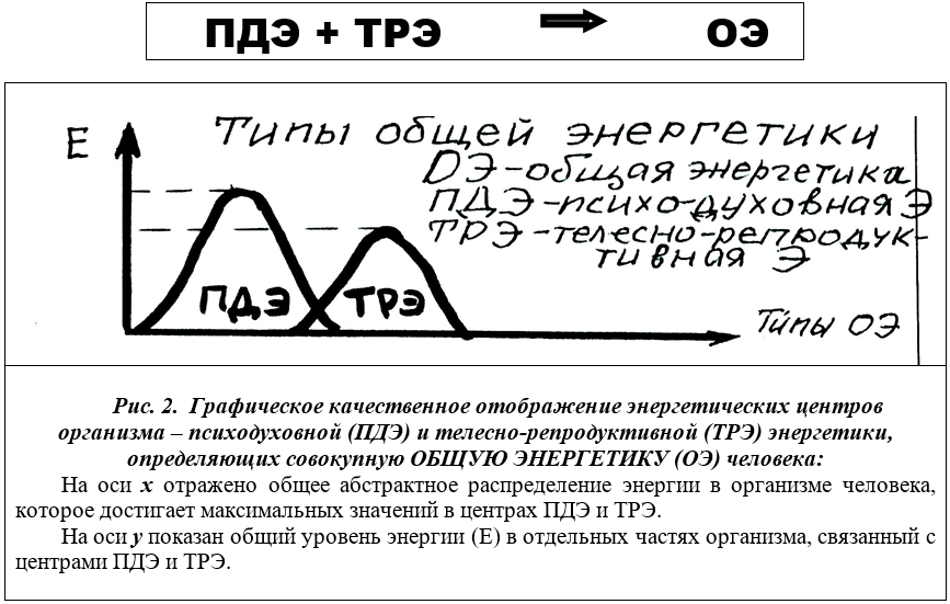 В нашей работе мы также изначально используем понятие энергетики активной системы [7]. Но рассматриваем его с экосистемно-философских позиций. Определяем (как показано выше), что эта энергия (энергетика) постоянно накапливается по мере жизнедеятельности и развития организма в ядрах его вещественного обмена со средой (телесно-репродуктивной энергетики — ТРЭ) и энергоинформационного обмена со средой (психодуховной энергетики — ПДЭ) (рис.1 и рис.2). А общий совокупный энергийный потенциал этих двух основных жизненных центров организма человека обозначаем как «общая энергетика» (ОЭ) человека.