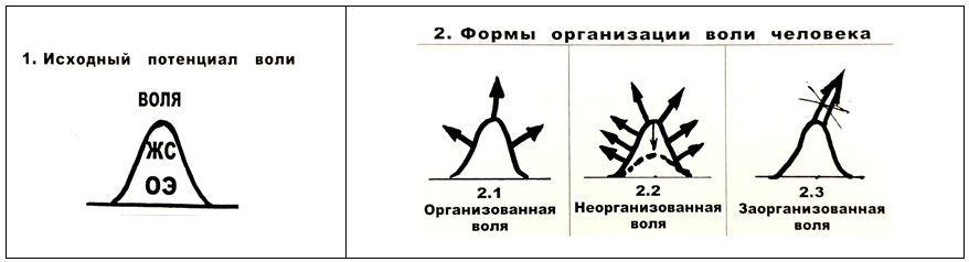 Воля характеризует тот самый кардинальный переход накопленных жизненных сил человека из возможности — в действительность, из потенциального взаимодействия — в кинетическое (практически деятельное). Воля становится не только совокупным потенциалом ПДЭ, ТРЭ, ОЭ, ЖС человека, но и организующим вектором его жизнедеятельности во всех проявлениях в окружающем мире.