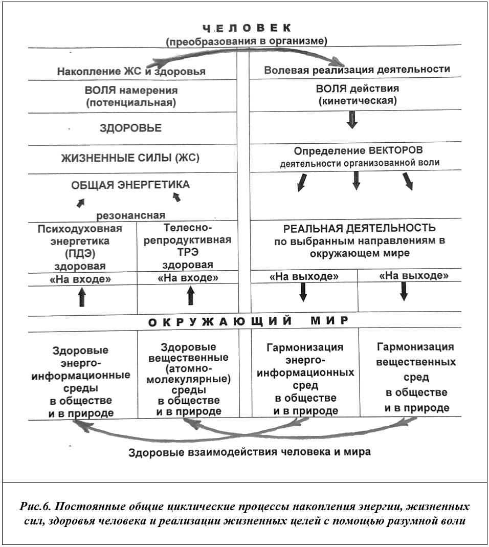 В целом же, потенциал общей энергетики, жизненных сил и здоровья всю жизнь накапливается в циклических процессах накопления — реализации жизненных сил, концентрации — расходования волевых усилий, как вовне, на разные виды деятельности, так и вовнутрь для укрепления своего здоровья (см. рис.6).