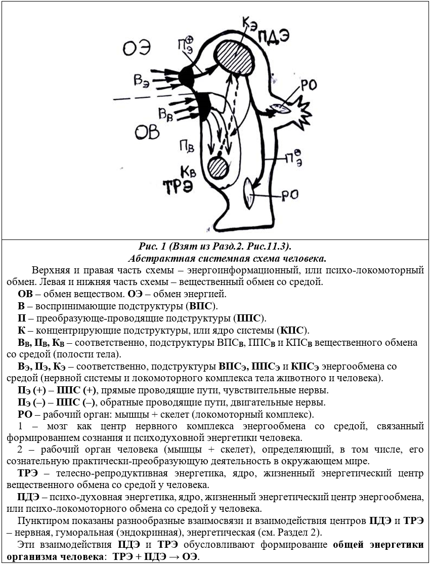 При рассмотрении общей энергетики, жизненных сил, здоровья и деятельности людей мы вновь сошлемся на базовую, образную системную схему человека как активной живой системы Мира, которая была рассмотрена нами в Разделе 2, рис. 11.3 [https://slavradio.org/public/chnpkz-6/]. Здесь мы её обозначим как рисунок 1.