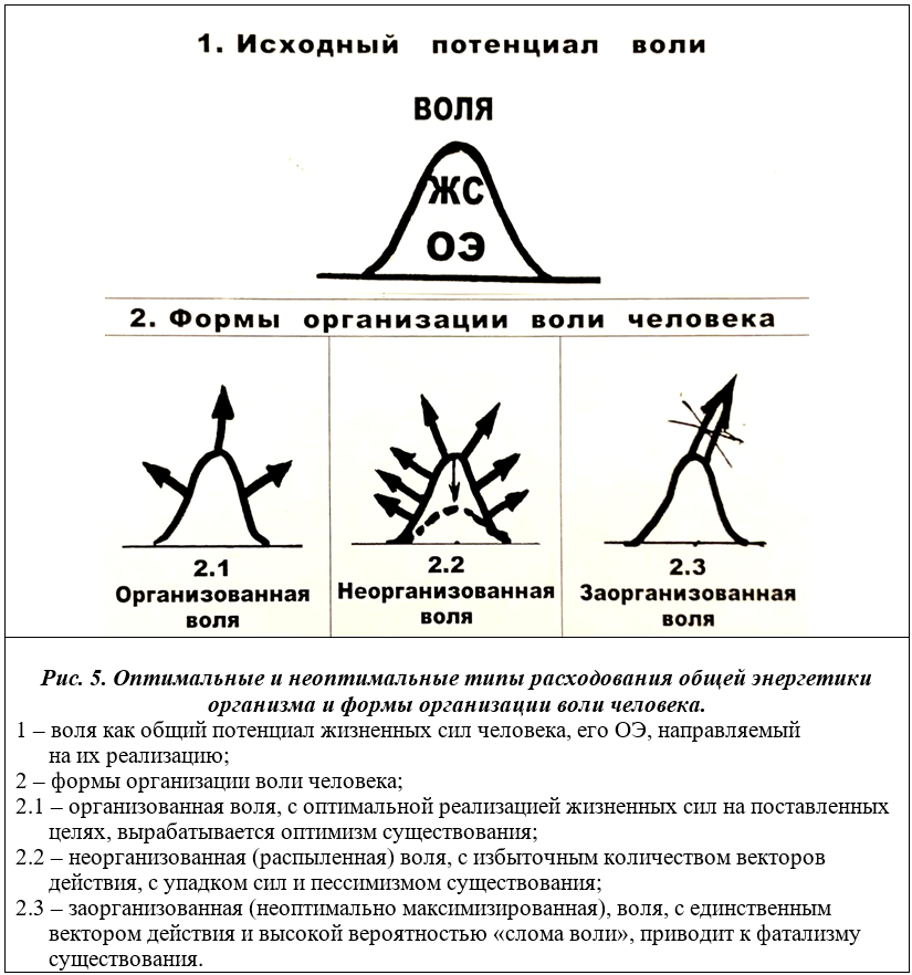 В рассматриваемой теме, на основе отмеченных понятий, далее обратимся к теоретическим и практическим аспектам рассмотрения энергетики, жизненных сил и воли человека. Как и в предыдущих Разделах нашей работы, рассмотрим разные режимы работы подсистем организма: оптимальный (здоровый) и неоптимальные (истощающий, избыточный и самосохраняющий в жестких условиях существования).