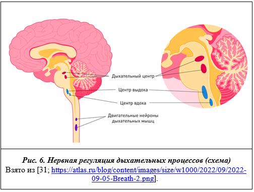 Наше дыхание не прекращается в течение всей жизни — ни в состоянии бодрствования, ни во сне. Дыхание — это процесс рефлекторный. Он осуществляется «автоматически» благодаря сложным взаимодействиям нейронов, распределённых по всей нервной системе. В организме существует целая нейросеть, генерирующая дыхательные ритмы. Дыхательный центр, а также центры сна и бодрствования, управления сердцем и тонусом сосудов находятся в подкорковых областях голового мозга — в отделах заднего и продолговатого мозга (рис.6).