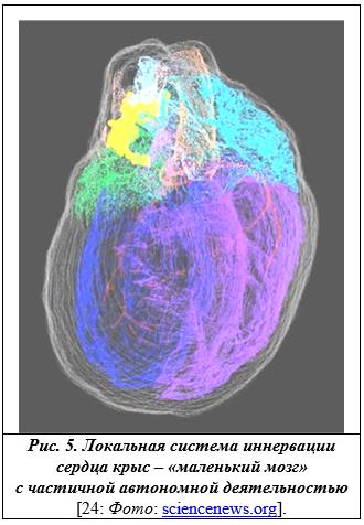 Таким образом, исследования последних лет показали, что в сердце существует, кроме общей, идущей от мозга, ещё локальная система иннервации [10]. Системный биолог Д. Швабер (Филадельфия) и его коллеги, на основе множества опытов, изобразили сердца крыс с помощью сканирующего микроскопа Knife-Edge. Они создали детальные снимки анатомии сердца крыс (рис.5) [8].