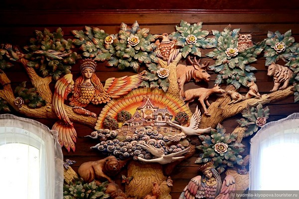 Вверху изображают птиц, у ствола - оленей, лосей, львов, единорога, а у корней - бобров, лягушек, змей, рыб. Вся картина мира цельной помещалась по дереву.
