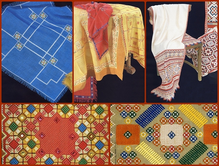 Русская вышивка делится на два основных типа: «верхошвы» - вышивку на сплошной ткани и «строчевую» («сквозную») – вышивку по ткани, превращенной выдергиванием нитей в своеобразную сетку. Было время, когда она встречалась на Руси повсеместно. Именно к строчевой вышивке и относятся цветная перевить и белая строчка-перевить, распространенные на калужской земле (местное название – «вырезы»). Народное вышивальное мастерство достигло здесь высокой степени совершенства. В крестьянском искусстве «вырезами» украшали чаще всего передники и полотенца. Их отличительная особенность – белые узоры на красном сквозном фоне. Часто узоры расцвечены небольшим вкраплением в вышивку нитей синего, желтого, зеленого цветов.