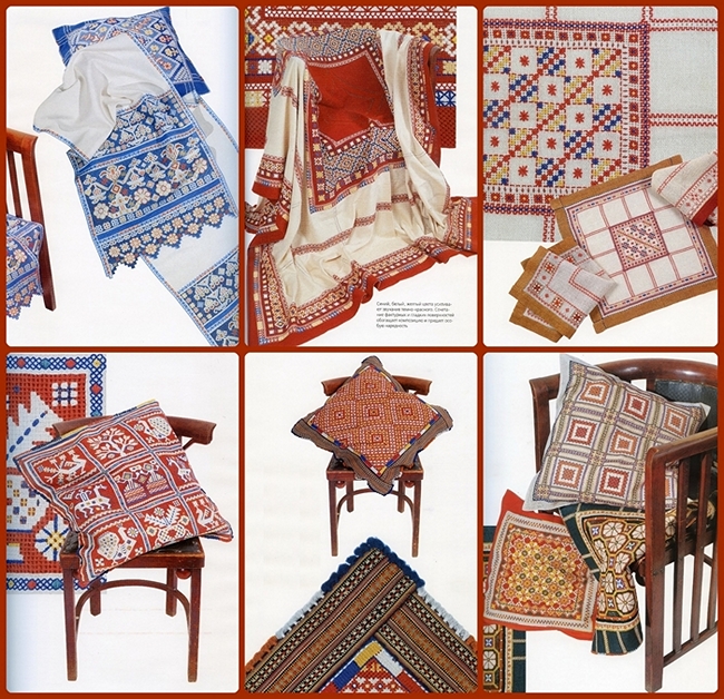 Тарусские мастерицы вышивали по сетке, которая плотно обвивается цветными нитями. Узор, выполненный цветной перевитью, всегда является основным в общем композиционном решении вещи, а часто и единственным. Многоцветные вкрапления в красно-белую гамму придают вышивке насыщенный колорит, ассоциирующийся с цветущими полями родной природы. Возможны и "белые вырезы”: белый узор дополняется цветными разделками, а иногда еще окружается небольшими мотивами росписи, выполняемой красными нитками.