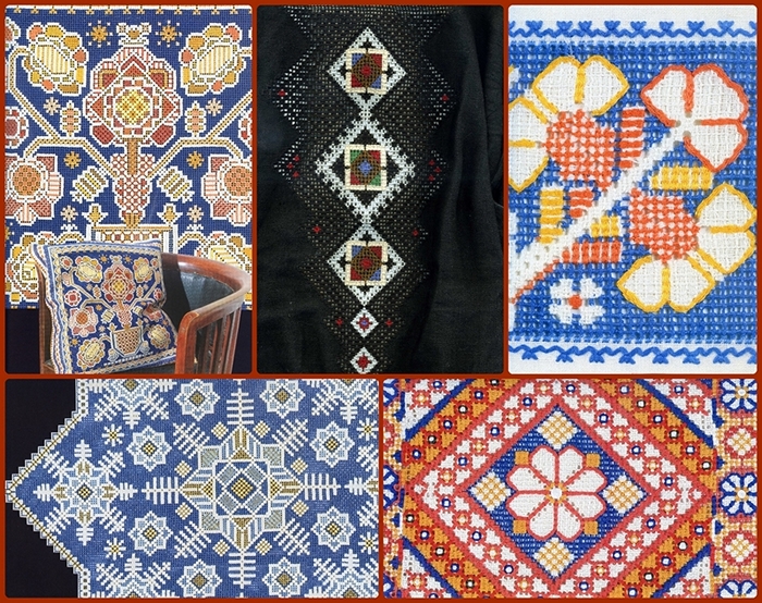 Калужская вышивка отличалась богатством орнаментальных мотивов: птицы с пышными хвостами и изогнутыми шеями, расположенные гуськом, вереницей или вперемешку с кустами, елочками; женские фигуры, по-местному - "куколки”, или "солдатики”, всадники на сказочных конях, барсы с поднятой лапой и закрученным на спину хвостом и т.д. Среди геометрических мотивов встречались ромбы, треугольники, цветочные розочки.