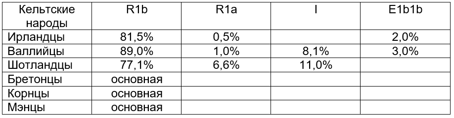 Воспользуемся для этого сведениями из «Википедии», приведёнными в статьях «Кельты» и «Гаплогруппы Y-ДНК среди народов мира».