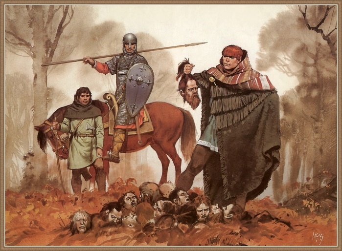 «Греческий историк Диодор Сицилийский писал, что, убив противника, кельтские воины «отрезают их головы и вешают на шеи своих коней, а принеся их домой, прибивают ко входам своих жилищ. Они сохраняли отрезанные головы побеждённых врагов в кедровом масле… А некоторые хвалились, что не отдали бы эти головы даже за такое же по весу количество золота…» Дело в том, что для кельтов голова — жилище души. И отрезать голову врага означало, что его душа отделена от его тела, и он не сможет ожить…»