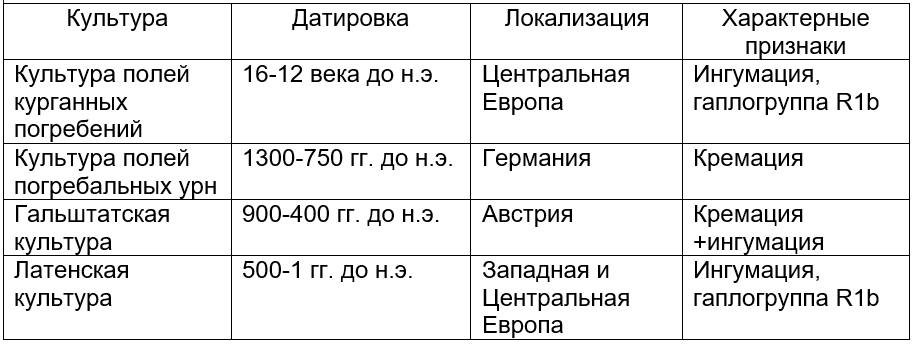 Из таблицы 1 следует, что культура полей погребальных урн, которой характерно трупосжигание или кремация фиксируется археологами приблизительно 3300 лет назад, подтверждая выводы ДНК-генеалогии о том, что в это время носители гаплогруппы R1a приходят в Европу с Русской равнины.
