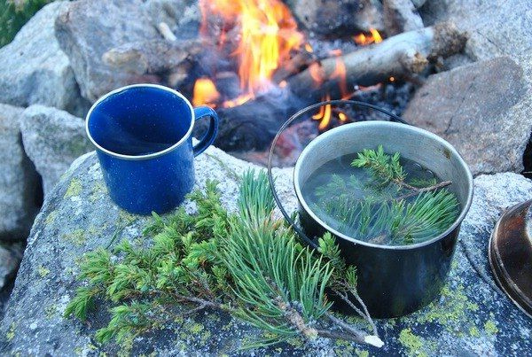 На колышках возле костра острыми донышками вверх висела самодельная посуда, сделанная из бересты. Дед взял одну посудину, называемую кружкой, ёмкостью около литра. Достал из кармана какие-то травы. Он успел насобирать их по дороге. Я узнал листья брусники, черники, хвою кедра и что-то было ещё, похожее на какие-то корешки.