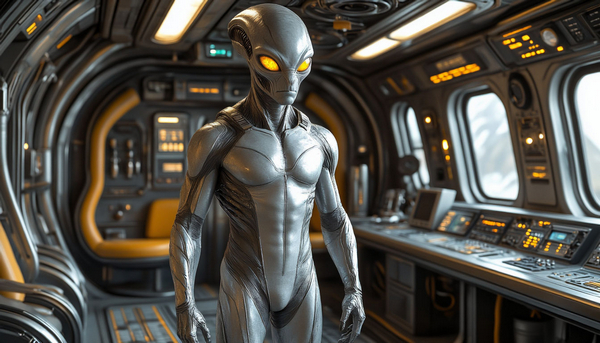 Не успел я это подумать, как одна из стен просто взяла и исчезла, образовав своего рода проход в коридор. В проёме я увидел необычное существо. Сначала из-за того, что позади незнакомца освещение было более ярким, я обратил внимание на его высокий рост и на его серебристый комбинезон. Когда глаза привыкли к свету, я уже не сомневался, что передо мной инопланетянин. В целом, его фигура была похожа на человеческую, только с очень широкими плечами и мощными, непропорционально короткими ногами. Лицо инопланетянина было полностью покрыто мелкой седоватой щетиной (по отношению к разумному существу не хочется применять слово “шерсть”). Два жёлтых глаза, глубоко спрятанных в удлинённой черепной коробке, пристально изучали меня, лишь изредка делая мигательные движения тяжёлыми веками.