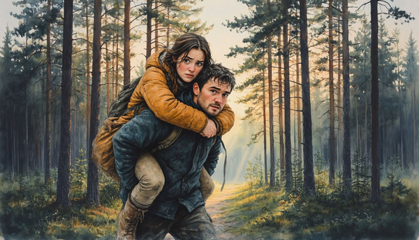 Мужчина вновь, словно маленького ребёнка, взял Наталью за руку, и они пошли дальше. По дороге Иван иногда аккуратно срезал ножом стебли каких-то трав или выкапывал из земли корешки. Этой нехитрой пищей, не слишком вкусной и не очень питательной, он угощал свою спутницу и жевал сам. Голод на некоторое время утихал, и можно было вновь продолжать путь. Так, иногда, делая привал для того, чтобы подкрепиться и отдохнуть, они шли целый день. Вечером, когда вновь стало темнеть, путники остановились у большого чёрного камня, чтобы переночевать. Чуть поодаль бежал небольшой ручей, и они с удовольствием из него напились, черпая воду ладонями. Наталья, словно маленький несмышлёный жеребёнок, с удовольствием пила из широкой ладони Ивана. На миг позабыв, где она и что с ней произошло, её сердце трепетало и переполнялось радостью и любовью к этому человеку.