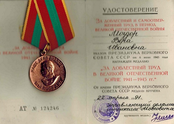 Я хочу написать об одном из многих награжденных этой медалью, моей маме, Моздор (Филькной) Вере Ивановне.