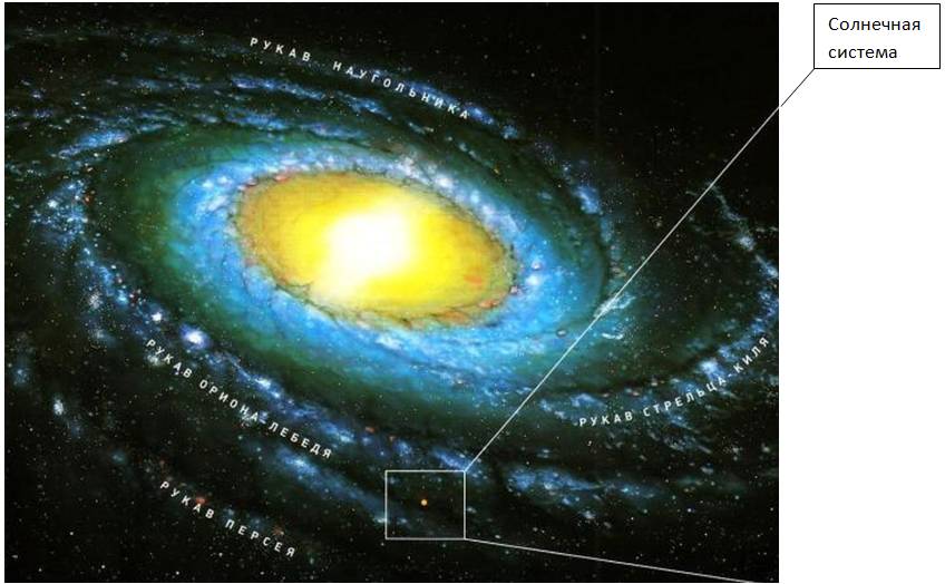 Ниже представлена картинка нашей Галактики построенная на основании этих данных и фотографий других спиральных галактик полученных с помощью орбитального телескопа «Хаббл».