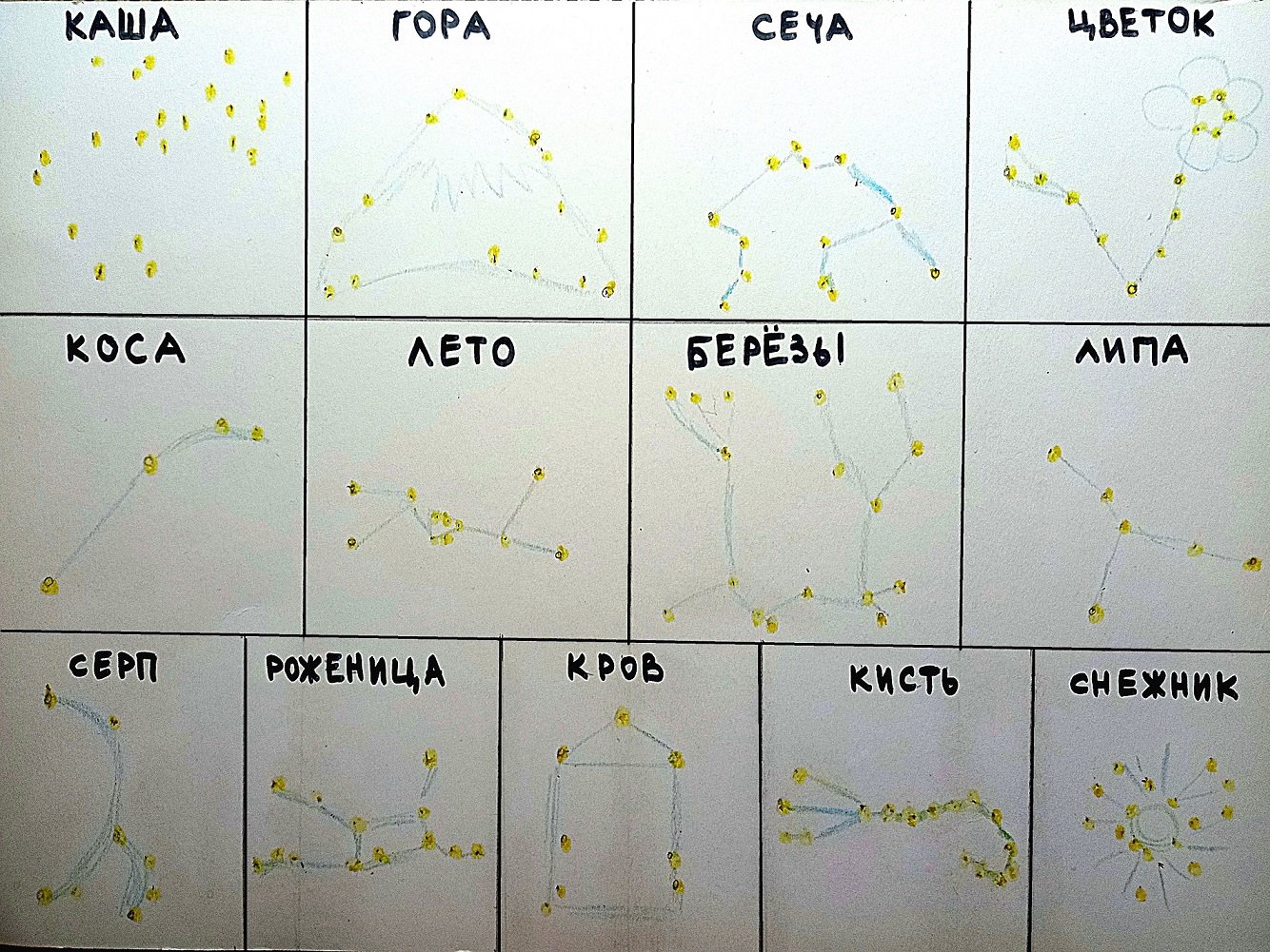 Итак, названия Месяцев-Созвездий по порядку: КАША, ГОРА/ЛЬДИНА, СЕЧА/БИТВА, ЦВЕТЫ, КОСА/ТРИЛИСТНИК, ЛЕТО/КУКУШКА, БЕРЁЗЫ, ЛИПА, СЕРП/ЧЕРВЬ, РОЖЕНИЦА, КРОВ, КИСТЬ, СНЕЖНИК.