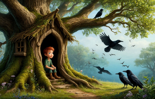 Повел лесовичек Русалченка к старому дубу. Там построил шалаш из веток, мха и травы, так, что никто не отличит его от кустарника, и посадил в него парнишку. Закончив приготовления, наши друзья стали ожидать появления вещих птиц. Скоро вороны стали слетаться. Когда все ведуньи были на месте, старшая из них сказала: