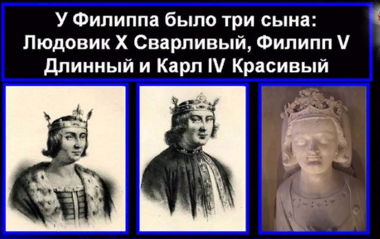 В течение 14 лет по разным причинам скончались все 3 сына Филиппа, не оставив прямых наследников. Народ Франции, как и было ему обещано, получил смерть, голод и хаос, возникшие в результате Столетней войны с Англией, начавшейся в 1337 году. А через без малого пятьсот лет в 1793 году на площади Революции был обезглавлен на гильотине представитель 13-го колена королевской династии Людовик XVI.