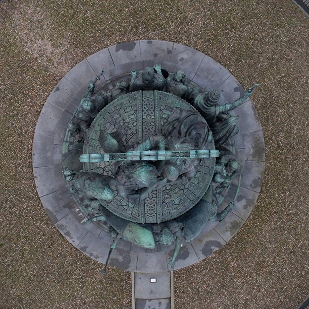 Теперь плавно переходим к нашему Памятнику. Но начнём по порядку и предлагаем вам вспомнить расположение 6 сюжетов из фигур на 2 ряду памятника. У нас есть фото Памятника с высоты птичьего полёта и помог нам рассмотреть его наш М. П. Кукштель, предложивший 6 основных фигурных композиций на 2 ярусе, напоминающих нам шесть направлений сторон света. Посмотрев на памятник сверху, четко видим 6 групп и их расположение мы связали с шестигранником модели М. Родина. Чувствуя внутреннее волнение, мы пошли дальше. Захотелось соты с цифрами Марко Родина мысленно наложить на 6 групп фигур Памятника (фото памятника сверху), где единица соответствует главной фигуре Рюрика со щитом и вместо чисел попробуем вставить буковки.