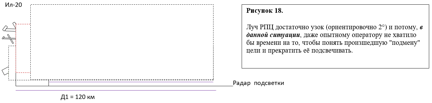 Ему ещё необходимо было двигаться со скоростью Ил-20, ибо ракета будет наводиться на ту цель, из двух попавших в луч подсветки, скорость сближения с которой ей задана от РПЦ и отражённый сигнал которой окажется мощнее (а выполнить это условие достаточно просто).